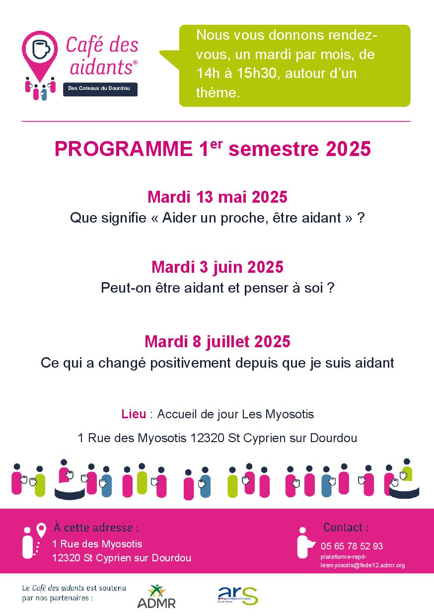 des aidants Les Myosotis de Saint-Cyprien-sur-Dourdou propose à partir du mois de mai 2025 un Café des Aidants® des Coteaux du Dourdou, labellisé par