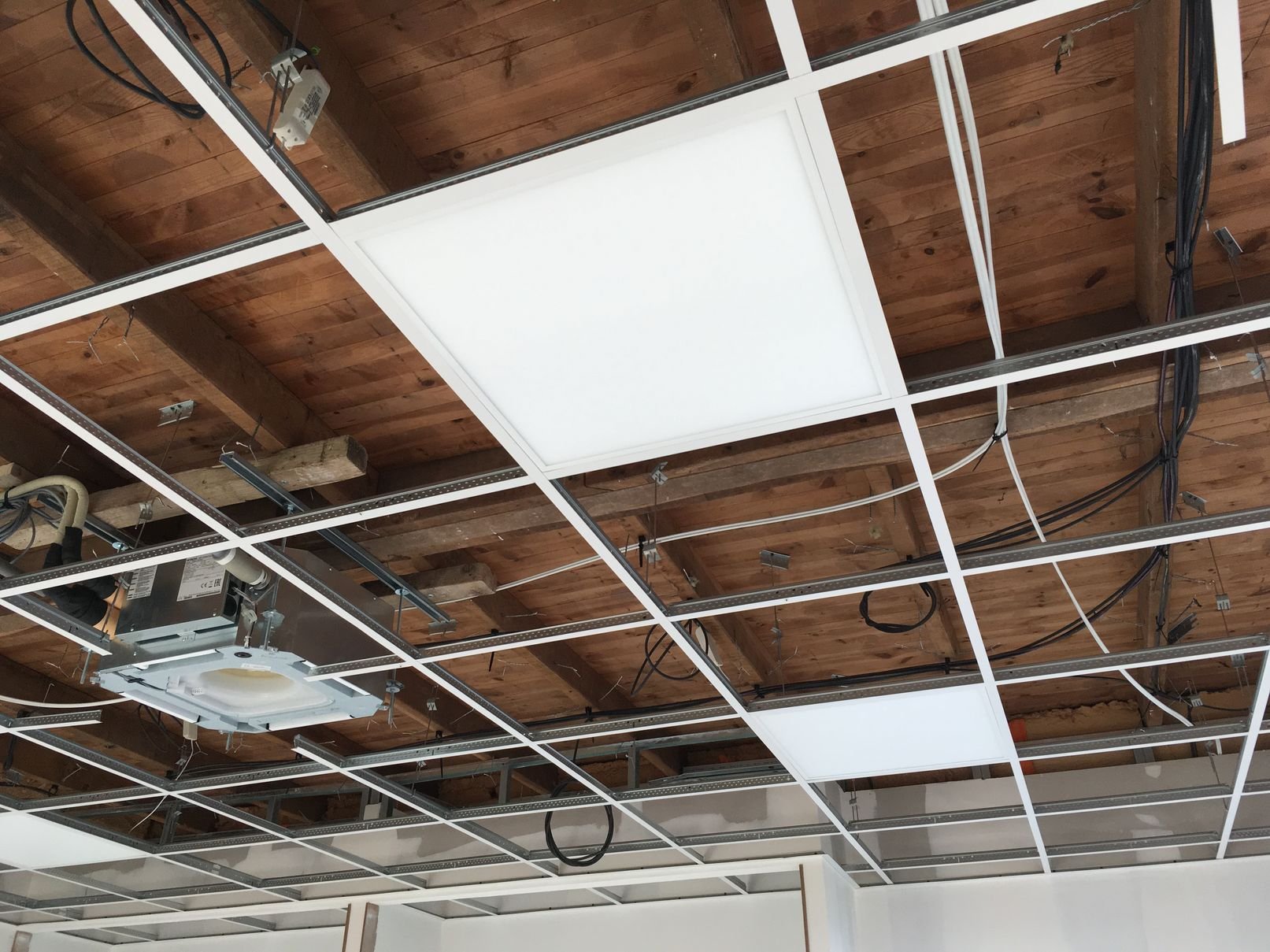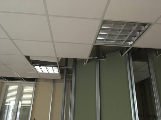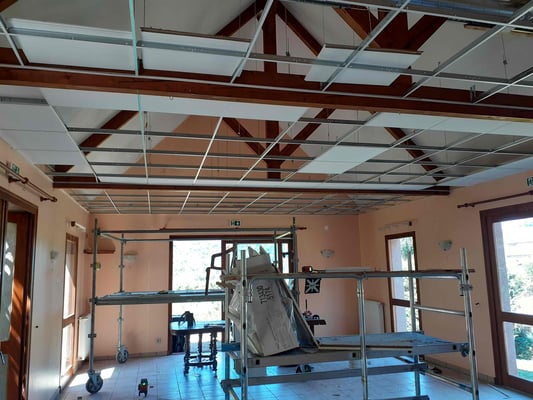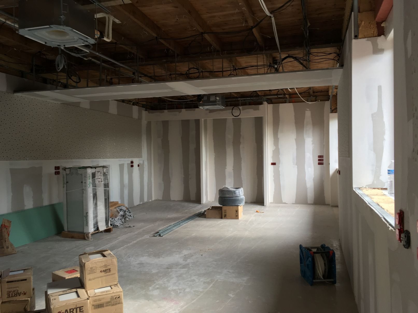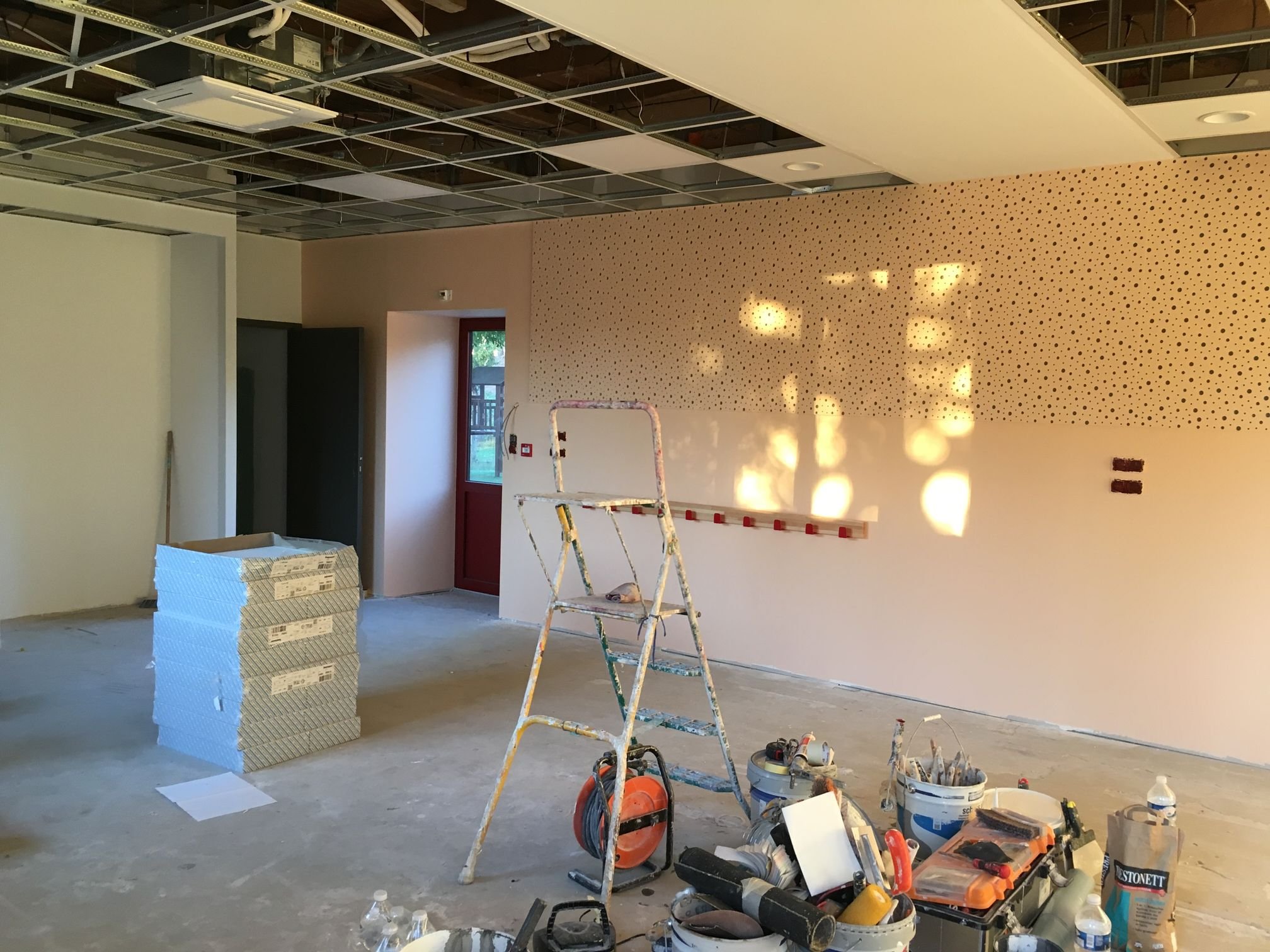 La première phase a consisté à la mise en oeuvre d'un nouveau plafond dans la salle de restaurant. Ce dernier est isolé et intègre des nouveaux luminaires led. Il doit permettre une économie sur le chauffage et un meilleur confort acoustique.