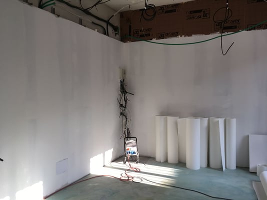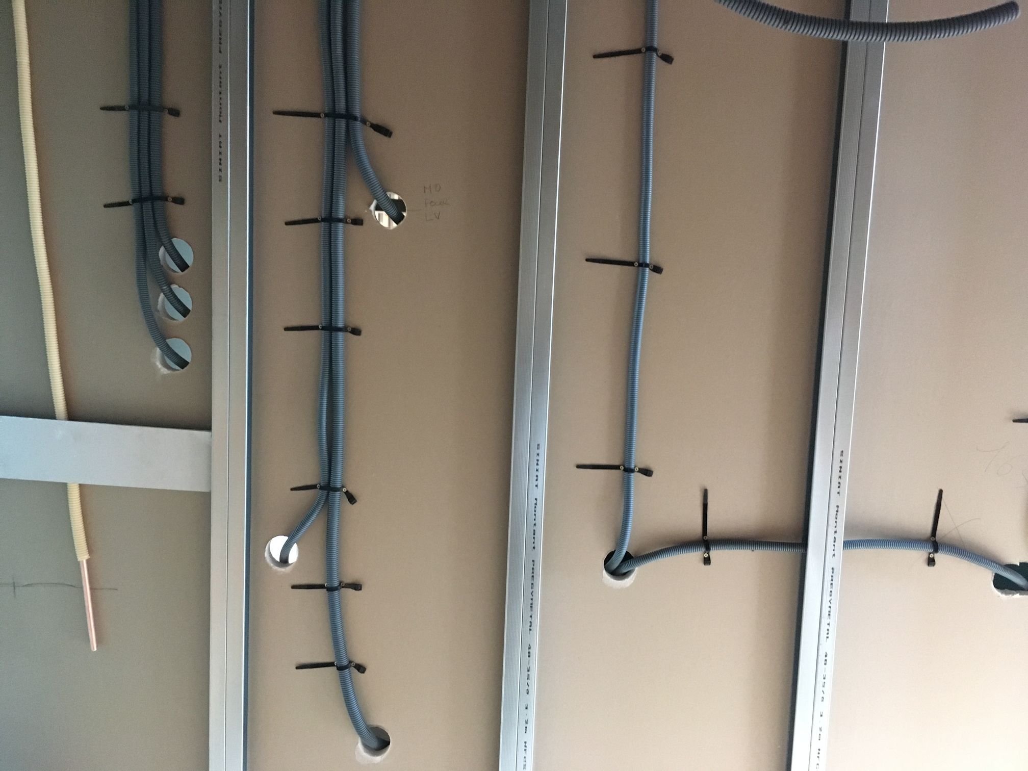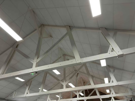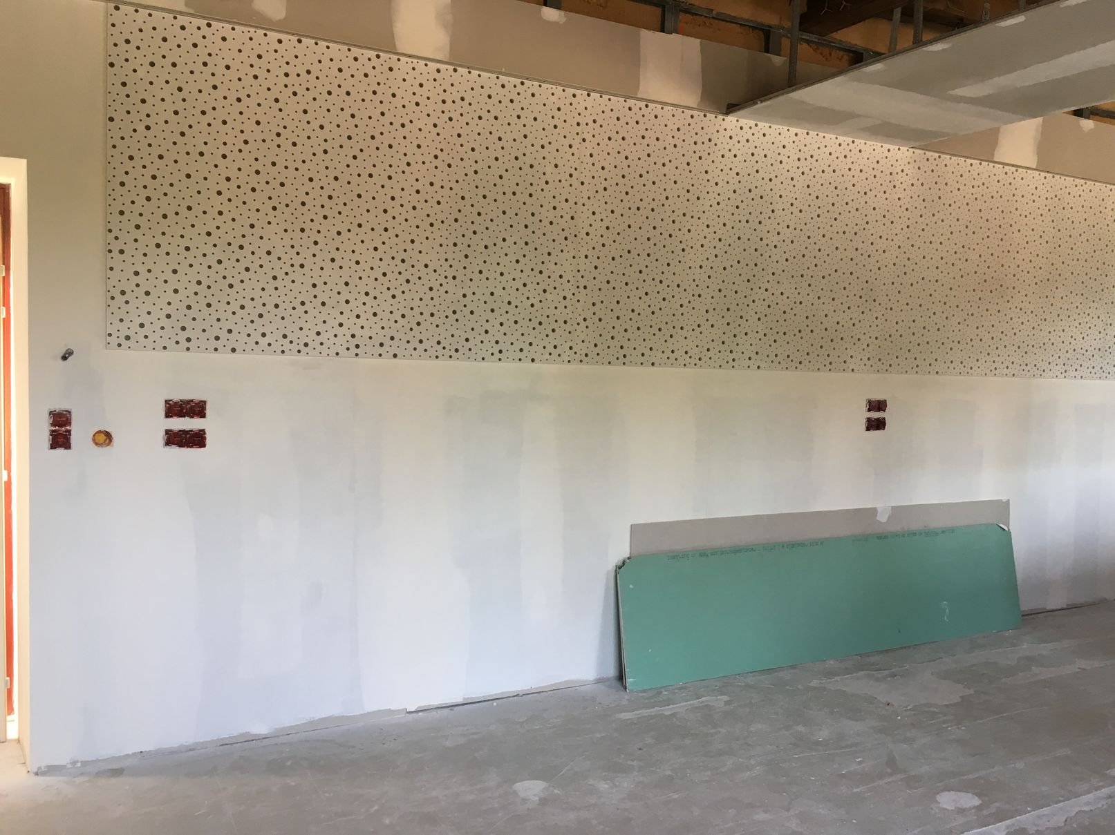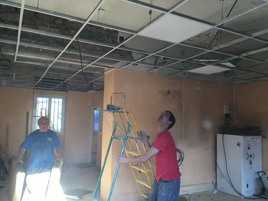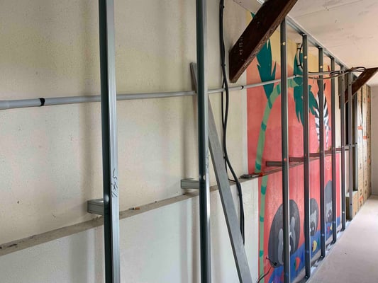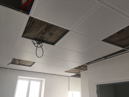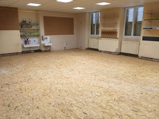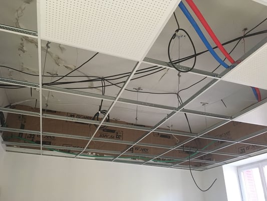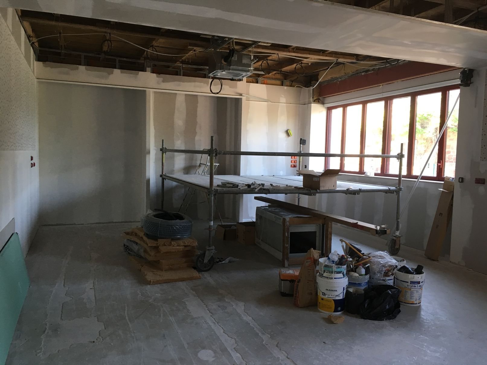 La première phase a consisté à la mise en oeuvre d'un nouveau plafond dans la salle de restaurant. Ce dernier est isolé et intègre des nouveaux luminaires led. Il doit permettre une économie sur le chauffage et un meilleur confort acoustique.