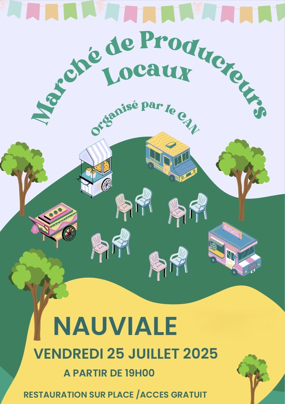 En raison des conditions météo, le marché de producteurs locaux se déroulera sur le pré à côté de la salle des fêtes (repli à l'intérieur si besoin).