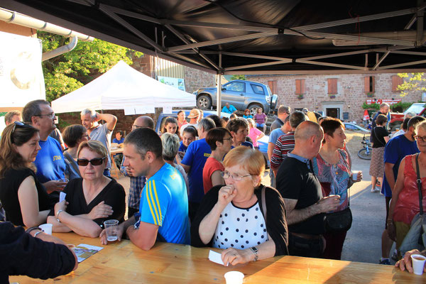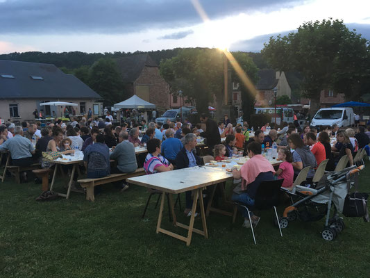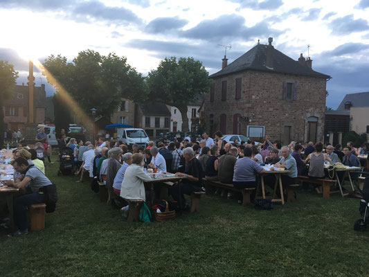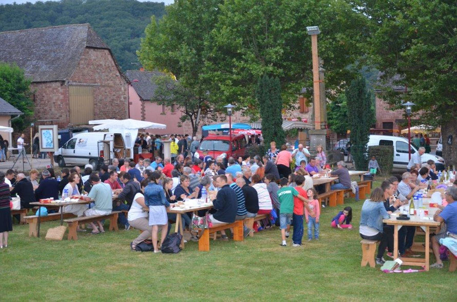 L'orage du début d'après midi n'aura pas empêché au traditionnel marché de pays de se tenir et toutes les tables et bancs disposés par le Comité d'Animation ont été largement utilisés pour l'évènement. Boeuf, agneau, charcuterie, riz de veau mais aussi vin de Marcillac, bière locale, tartes et glaces ont été de la partie.