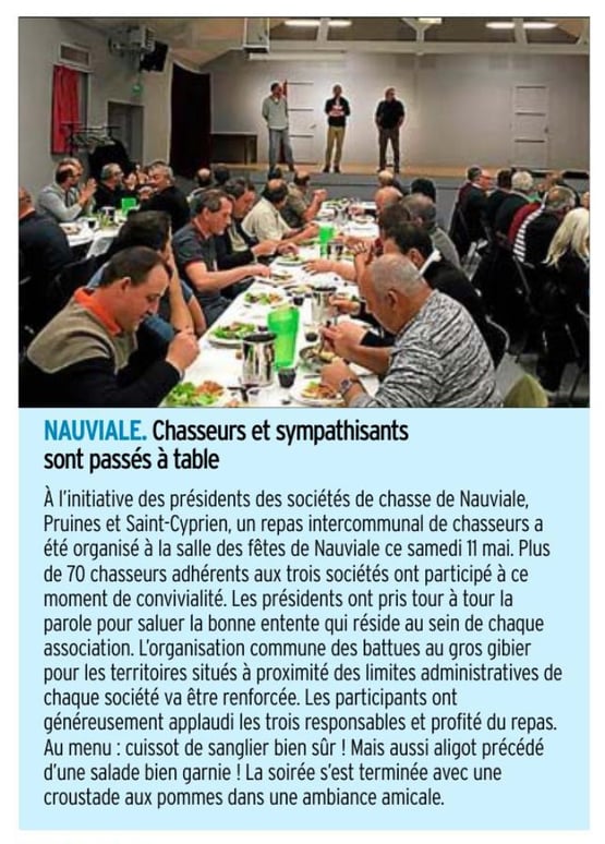 A l'initiative des présidents des sociétés de chasse de Nauviale, Pruines et Saint Cyprien, un repas intercommunal de chasseurs a été organisé à la salle des fêtes de Nauviale ce samedi 11 mai. Plus de 70 chasseurs adhérents aux trois sociétés ont participé à ce moment de convivialité. Les présidents ont pris tour à tout la parole pour saluer la bonne entente qui réside au sein de chaque association. L'organisation commune des battues au gros gibier pour les territoires situés à proximité des limites administratives de chaque société va être renforcée. Les participants ont généreusement applaudi les trois responsables et profité du repas. Au menu : cuissot de sanglier bien sûr! mais aussi Aligot précédé d'une salade bien garnie ! La soirée s'est terminée avec une croustade aux pommes dans une ambiance amicale.