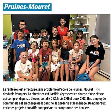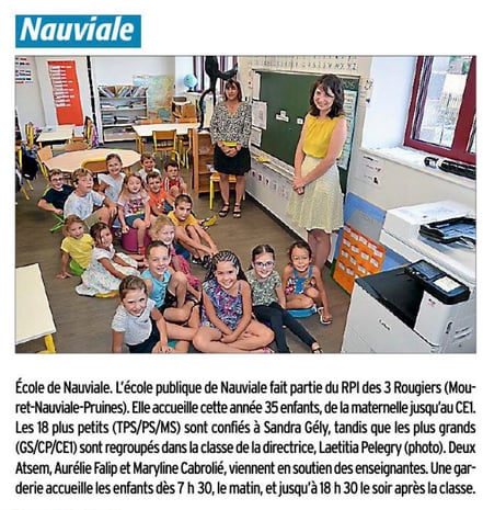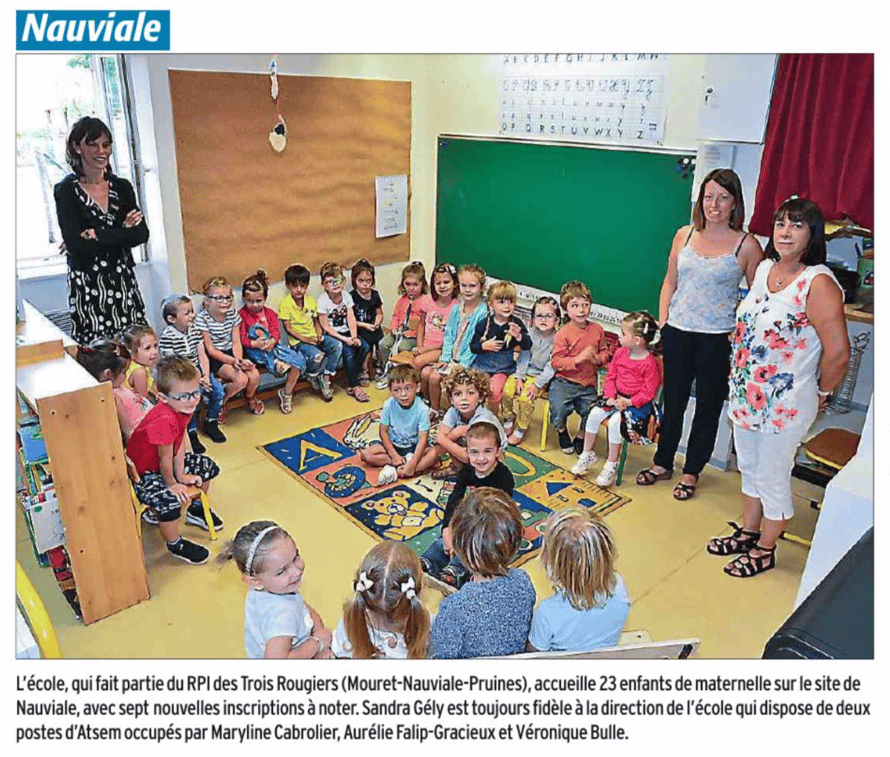 Reprise de l'école réussie pour les élèves de maternelle du RPI Mouret Nauviale Pruines. Les parents ont massivement partagé ce moment ce lundi 2 septembre avec leurs enfants et la directrice du site Sandra Gely accompagnée de Maryline et Aurélie.