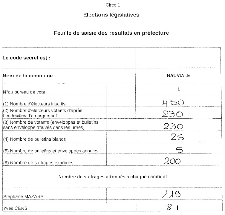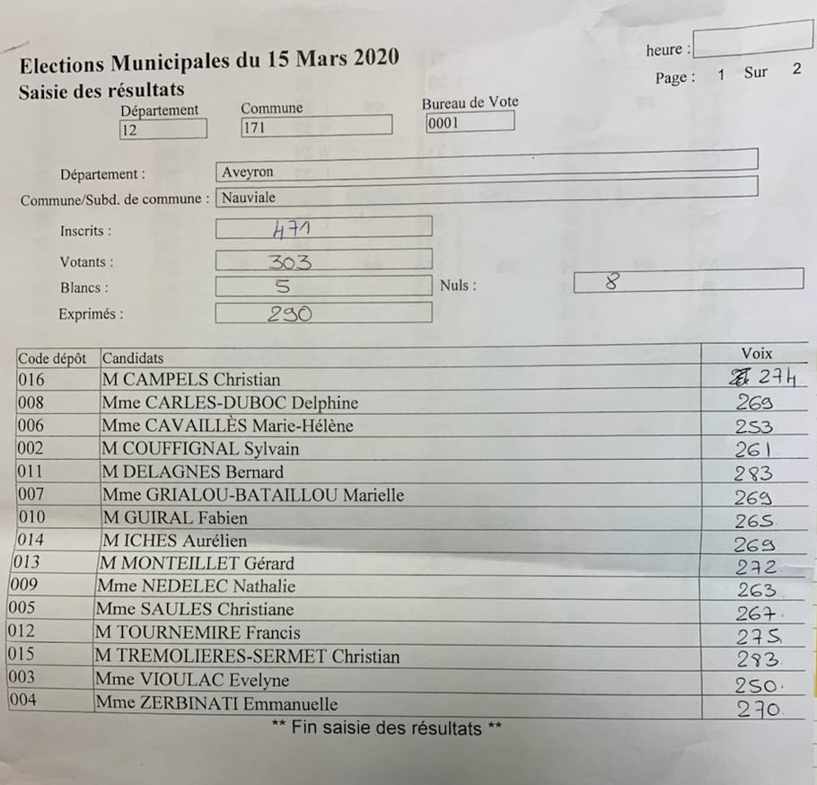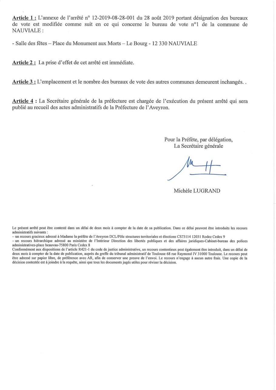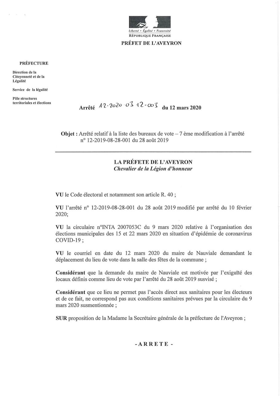 Afin de tenir compte de la dernière circulaire du ministère de l'intérieur précisant les modalités d'organisation des élections municipales avec l'épidémie de coronavirus covid-19, le bureau de vote de Nauviale a été délocalisé à la salle des fêtes à la place de la salle du conseil de la mairie.