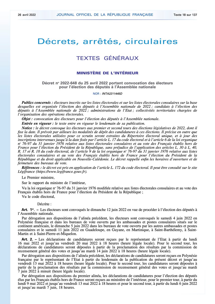 Les élections législatives sont fixées au dimanche 30 juin et 7 juillet 2024.