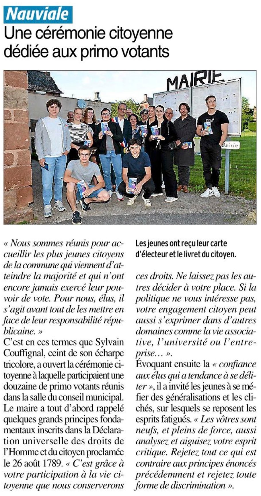 Nous sommes réunis pour accueillir les plus jeunes citoyens de Nauviale qui viennent d’atteindre la majorité et qui n’ont jamais exercé leur pouvoir de vote. Pour nous, élus, il s’agit avant tout de les mettre en face de leur responsabilité républicaine.