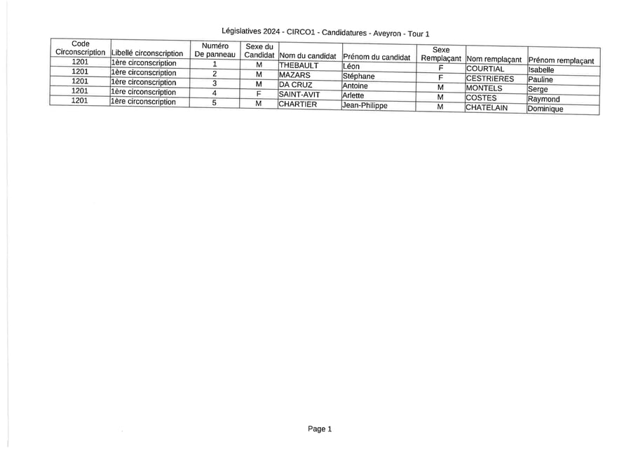 Liste des candidats pour la première circonscription :
