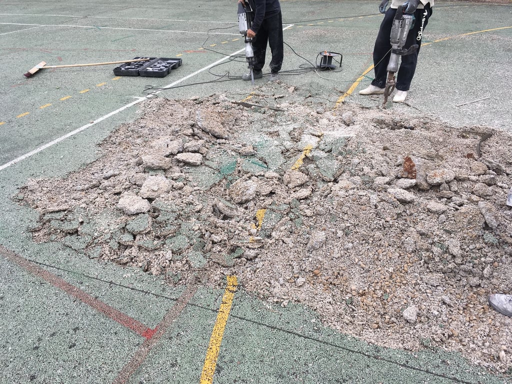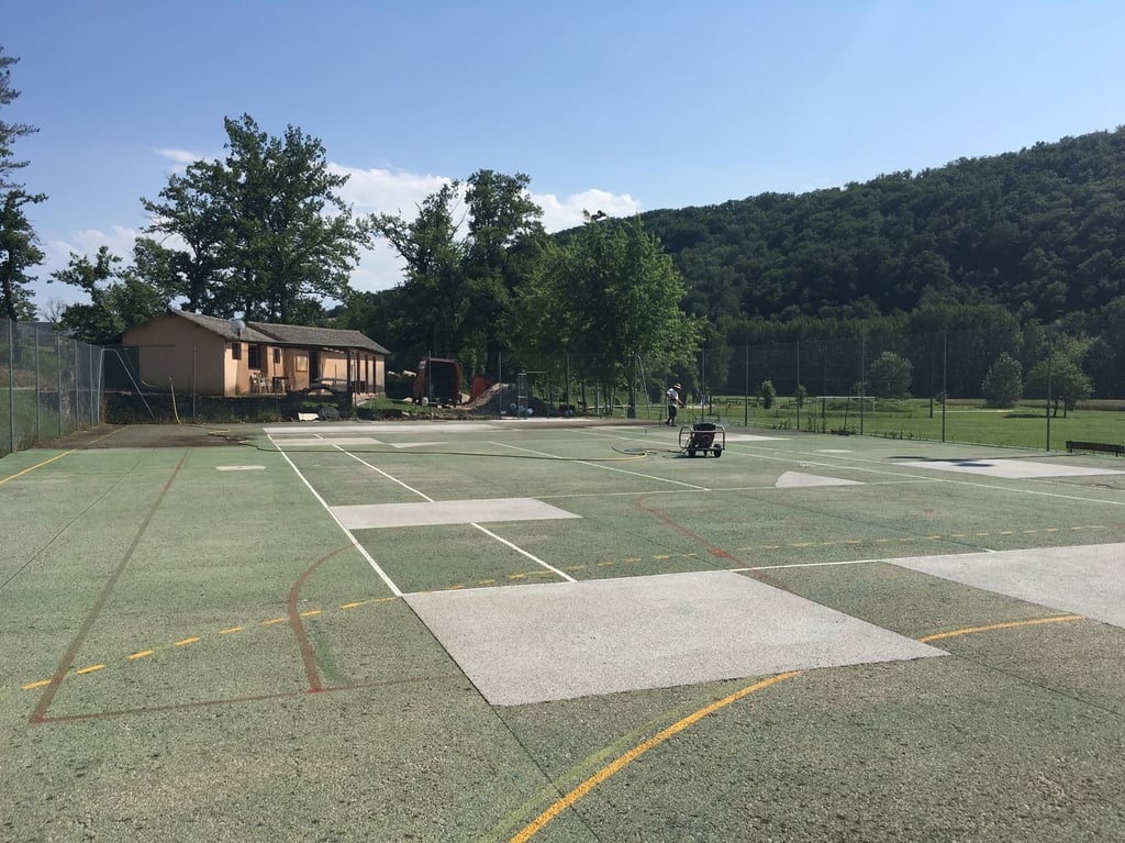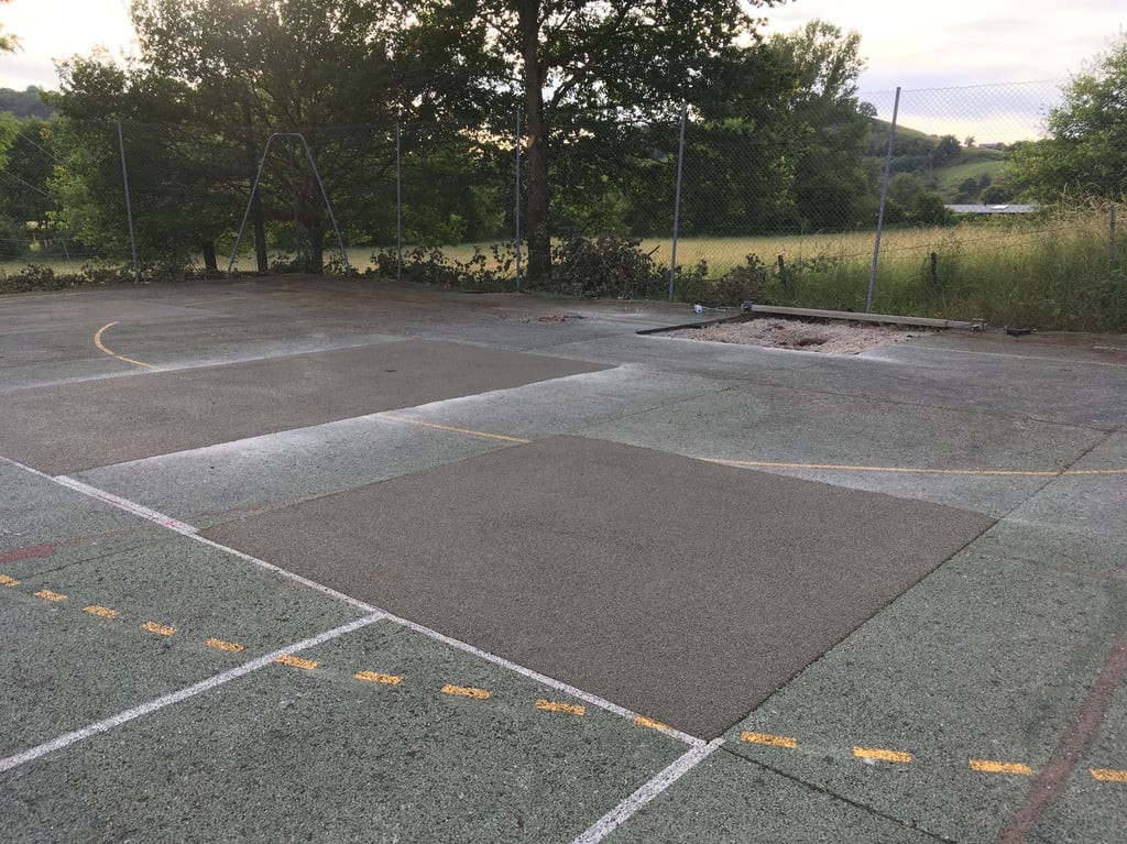 Les travaux ont consisté à la réfection partielle de la dalle béton, au nettoyage et à la remise en peinture des terrains de volley, tennis, hand et basket et la remise en état des clôtures extérieures.