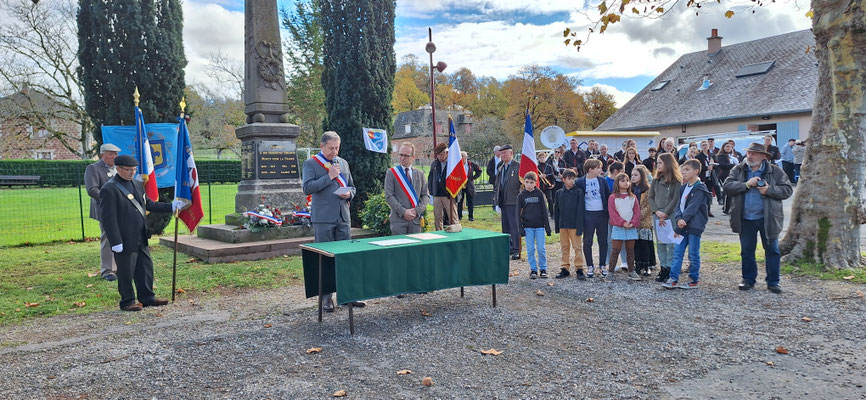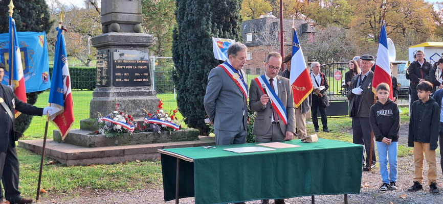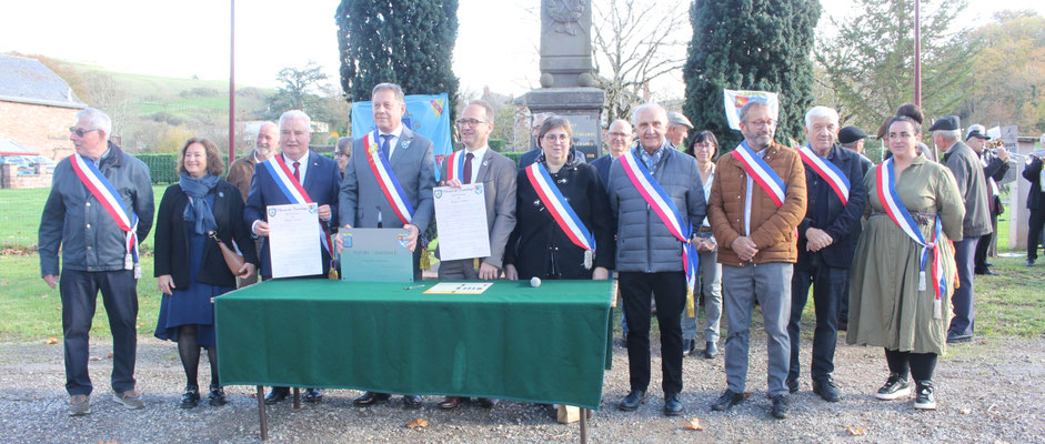 La journée du dimanche fut particulière car après la traditionnelle cérémonie de commémoration du 11 novembre qui s’est déroulée devant les officiels (maires ou élus des communes avoisinantes, sénateur, conseiller départemental) et devant un nombreux public, les maires de Nauviale et Fleury ont procédé à la signature de la charte de jumelage après avoir effectué conjointement une lecture publique de cette même charte.