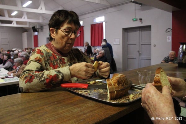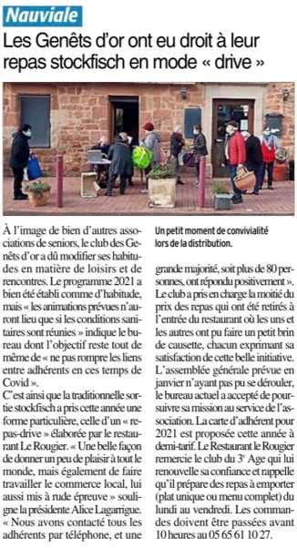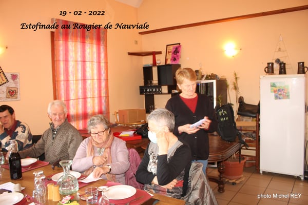 Préparé de mains de maître par l’équipe du restaurant Le ROUGIER de Nauviale, le repas, copieux à souhait, se composait d’une soupe de campagne, d’une entrée composée d’une tranche de pâté en croûte, gésiers frits et lamelles de jambon cru sur un lit de salade, suivait le majestueux stockfish accompagné d’un plat de carottes et champignons, fromages, St Honoré et café clôturaient ce moment convivial.