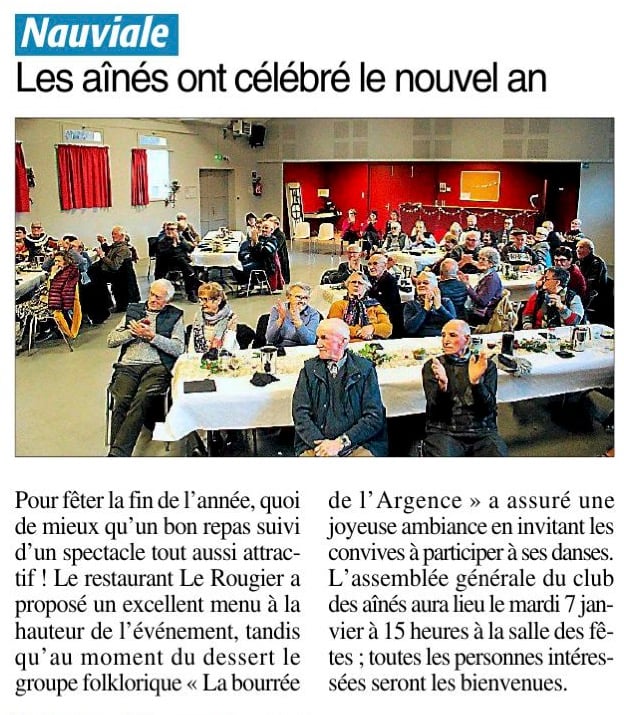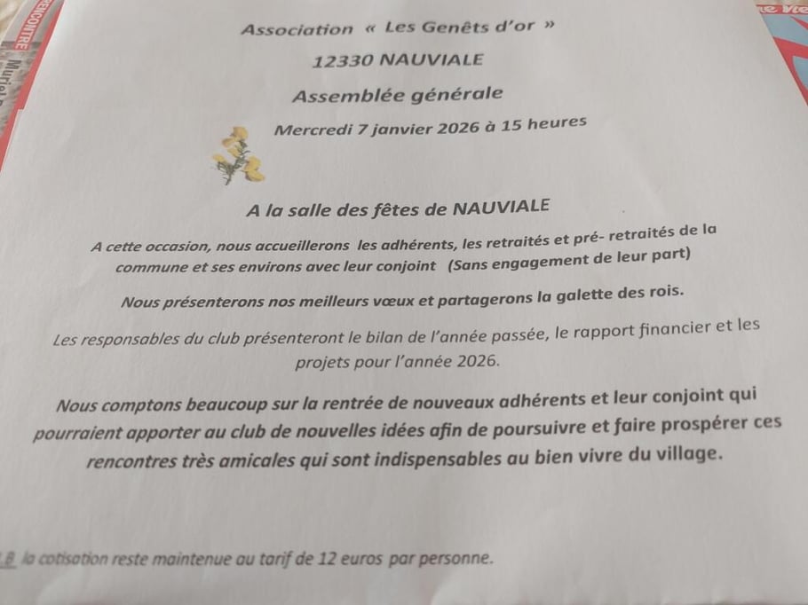 Mardi 10 Janvier 2023, à 15h, déroulera, à la salle des fêtes de Nauviale, l’assemblée générale annuelle.