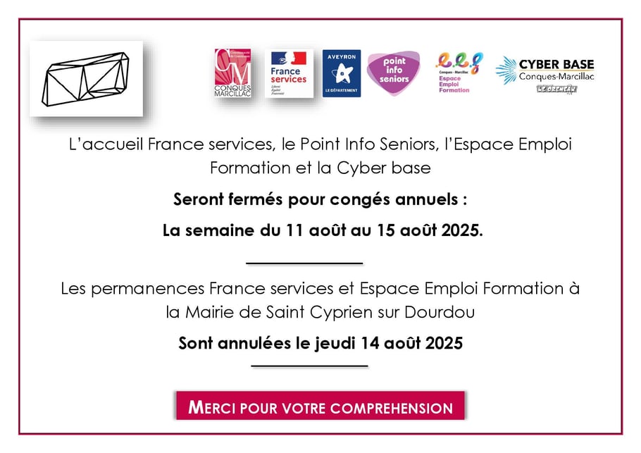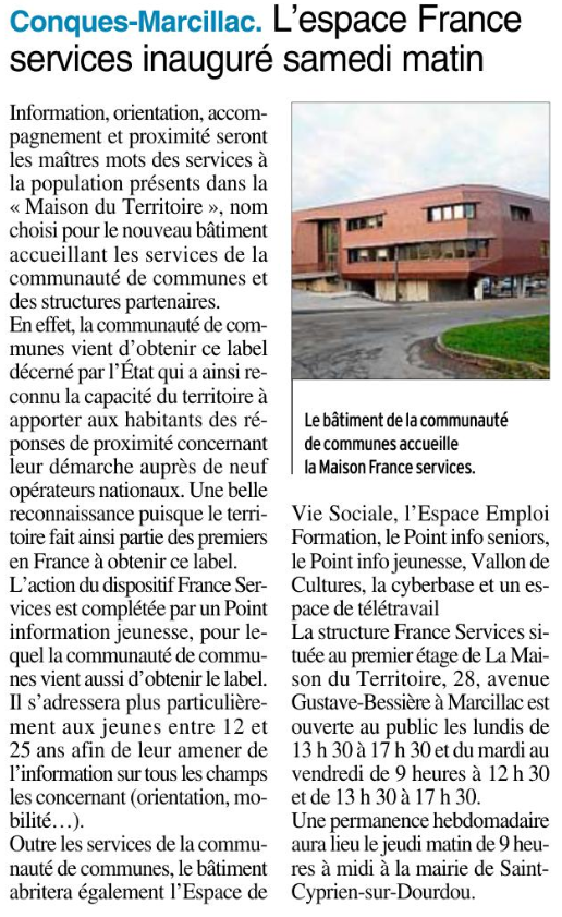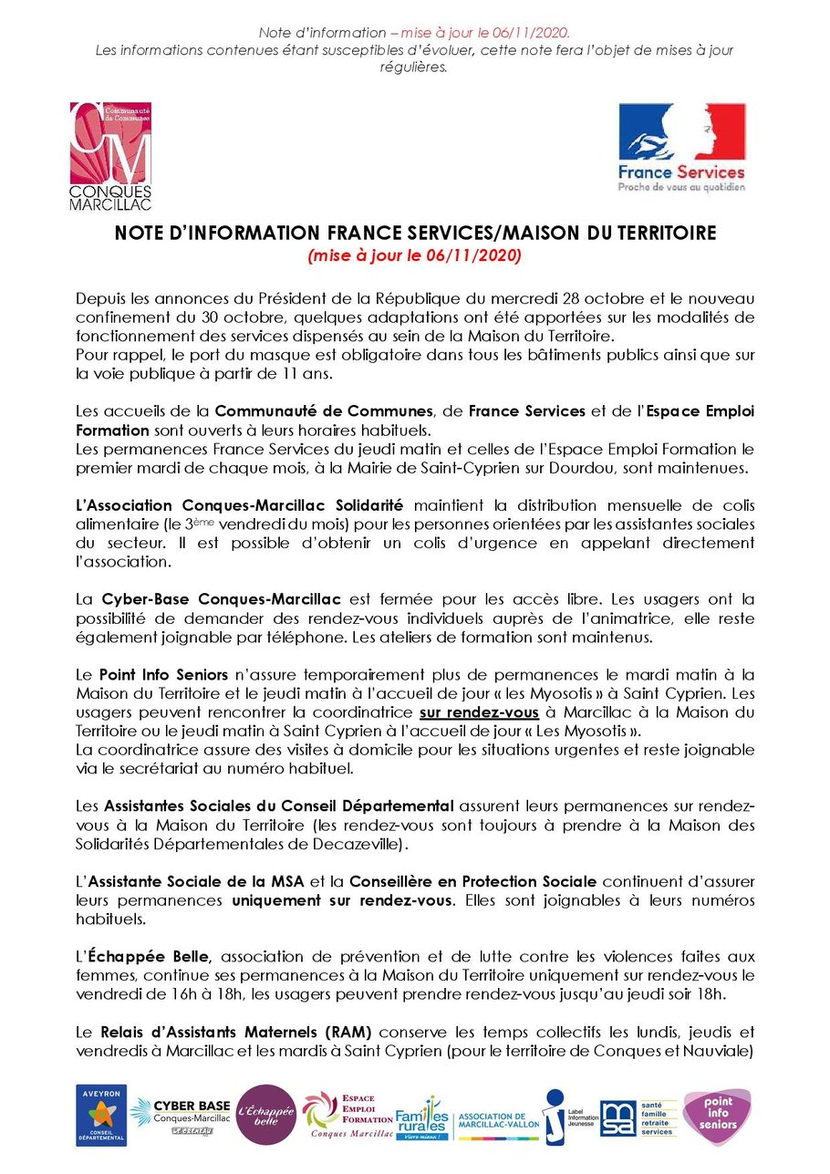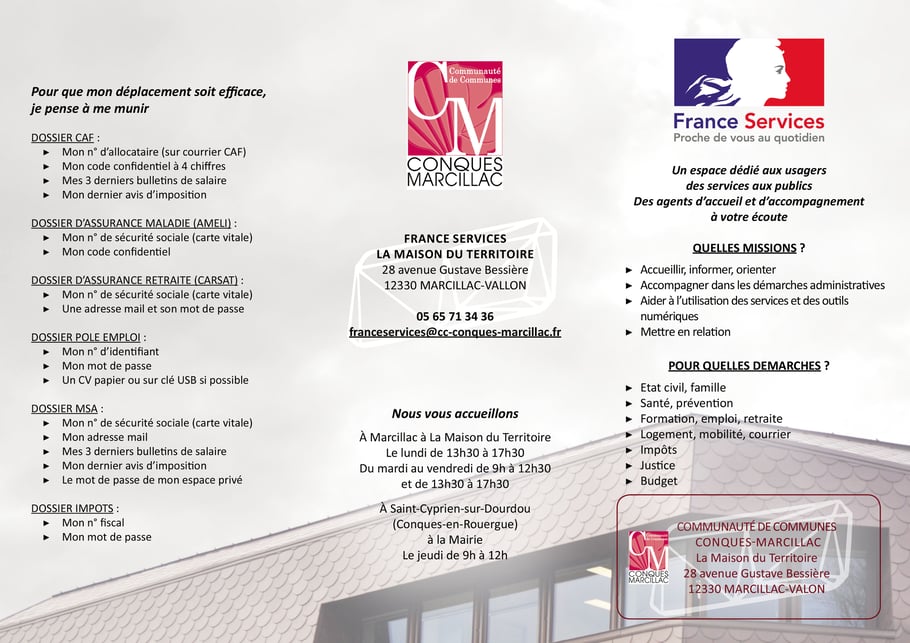 France services Conques-Marcillac ouvre ses portes aux habitants du territoire lundi 9 octobre de 9h30 à 11h30, à la Maison du Territoire à Marcillac Vallon