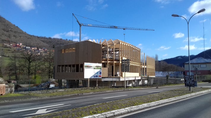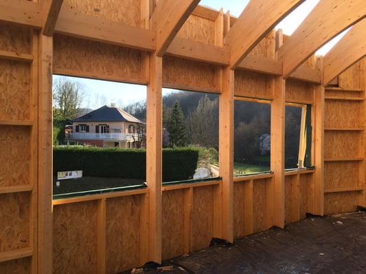 Les charpentiers, entreprises SINGLARD et SICOB en groupement, ont démarré avec la pose des poteaux structurels début décembre. A la mi-janvier, les poteaux, solives et les panneaux OSB du plancher ont été posés sur la moitié du bâtiment (dénommée Partie 1). La pose des arbalétriers et des murs ossature bois (MOB) a été réalisée en mars.