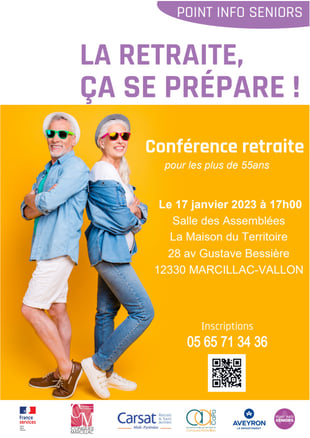 En partenariat avec la CARSAT Midi-Pyrénées et le Point Info Seniors Conques-Marcillac, nous organisons une conférence retraite « La Retraite ça se prépare » à destination des personnes de plus de 55 ans du territoire Conques-Marcillac le mardi 17 janvier 2023 à 17h, à La Maison du Territoire à Marcillac-Vallon, Salle des Assemblées.