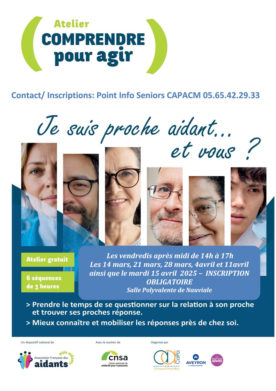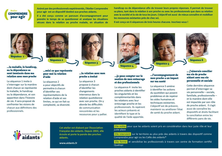 L’atelier Comprendre pour agir, développée par l’Association Française des aidants, et soutenue par la Caisse Nationale de Solidarité pour l’Autonomie (CNSA), est un dispositif proposant six séquences de trois heures chacun à destination de tous les proches aidants.