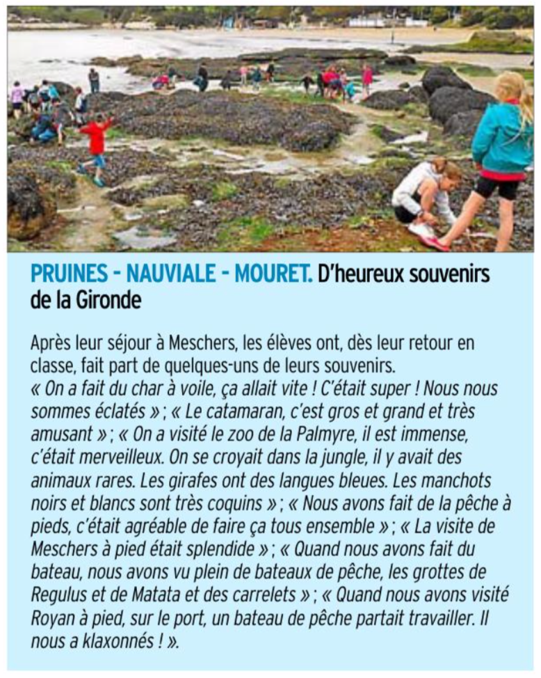 Tout le monde est reparti ravi ! Remerciement aux 3 mairies, aux JPA, au conseil départemental et à l’APE pour leur participation financière ainsi qu'aux PEP 12 organisateur du séjour, Brigitte Pouget, Anne Bouyjou et Marie-Hélène Laporte, les accompagnatrices.