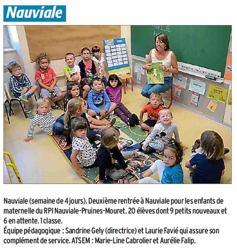 Le site de Nauviale, dévolu aux maternelles, a donc accueilli les enfants et leurs parents, en présence de Mme Gély enseignante directrice du site, du personnel communal (Aurélie, Laurence et Mary) et de quelques élus.