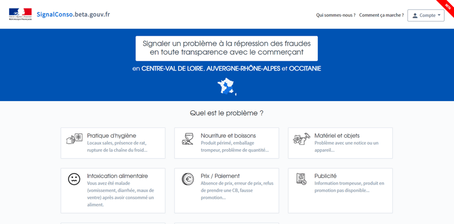 La Direction générale de la Concurrence, de la Consommation et de la Répression des fraudes (DGCCRF), en partenariat avec la Direction Interministérielle du Numérique, lance un nouveau service public en ligne : SignalConso. Les régions Centre-Val de Loire, Auvergne-Rhône-Alpes et Occitanie ont été choisies comme zones d’expérimentation pour ce projet que vous découvrirez plus en détails ici.