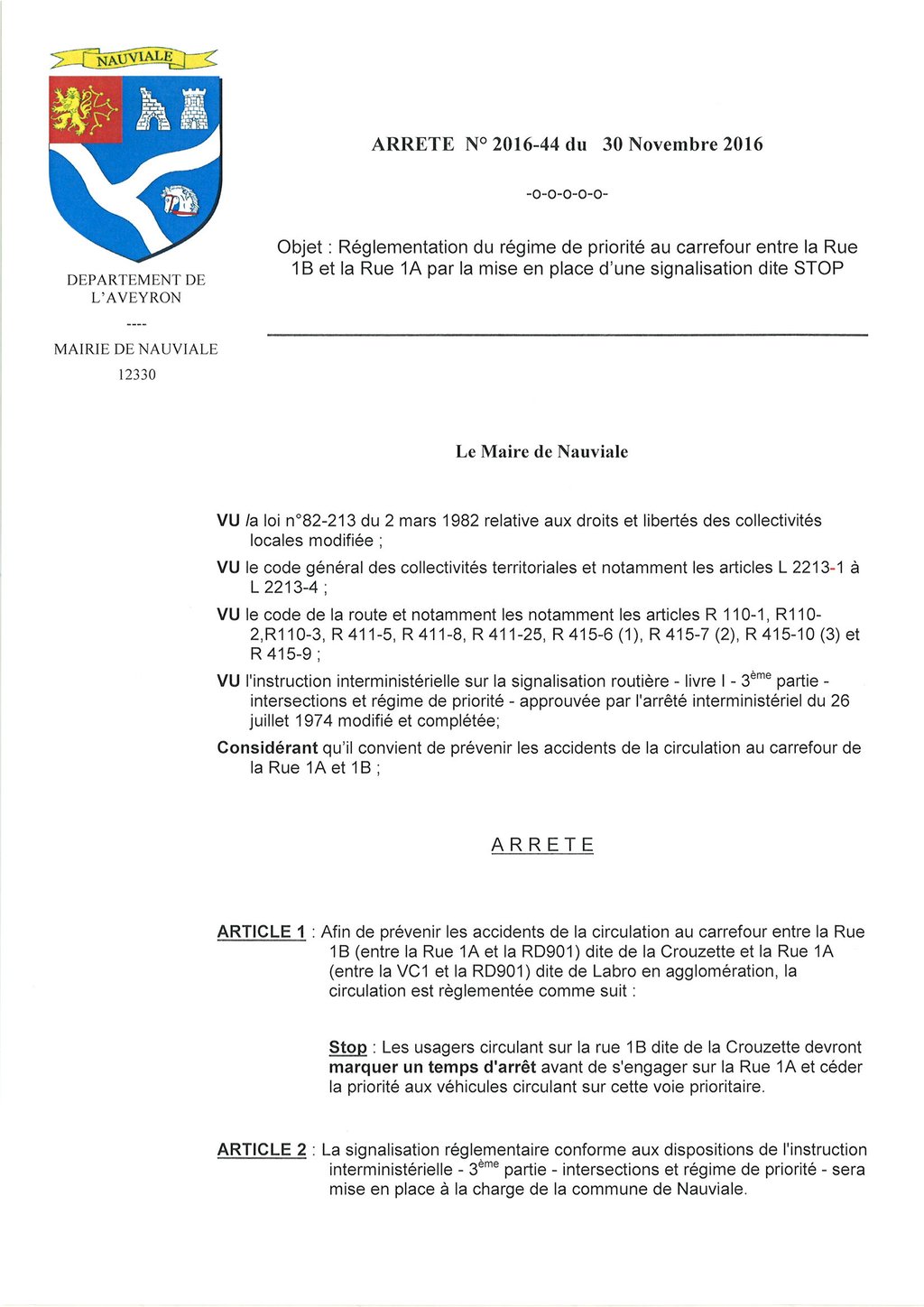 Par arrêté municipal, le régime de priorité de ce carrefour a été changé pour plus de sécurité. Dorénavant, tous les usagers arrivant par la rue dite de la Crouzette devront marquer un arrêt STOP avant de s'engager vers la route de Labro. Nous rappelons que ces voies sont à ce niveau dans l'agglomération de Nauviale et que par conséquent, la vitesse est limitée à 50km/h pour tous les véhicules et dans les deux sens de circulation.