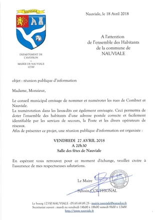Vendredi 27 avril la municipalité a organisé une réunion publique pour évoquer son projet d’adressage de la commune. Cet adressage vise mettre en place une dénomination et numérotation des voies nommage des rues pour les bourgs de Combret et Nauviale, la numérotation sera également étendue à l’ensemble des lieux dits de la commune.