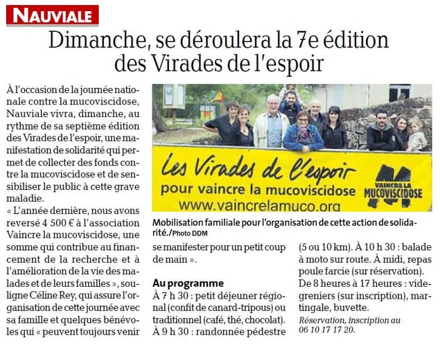 Et pour la 6ieme année, les virades de l’espoir de Nauviale ont régalées les participants. Dès le matin, petit déjeuner, à la française, steak et tripoux faisaient le bonheur des gourmands. Puis vers 10h, pendant que le vide-grenier recevait les premiers acheteurs, deux balades s'organisaient une pédestre et une à moto, afin de découvrir la région. C'est pour midi que les gourmets se sont retrouvés pour déguster une poule farcie.